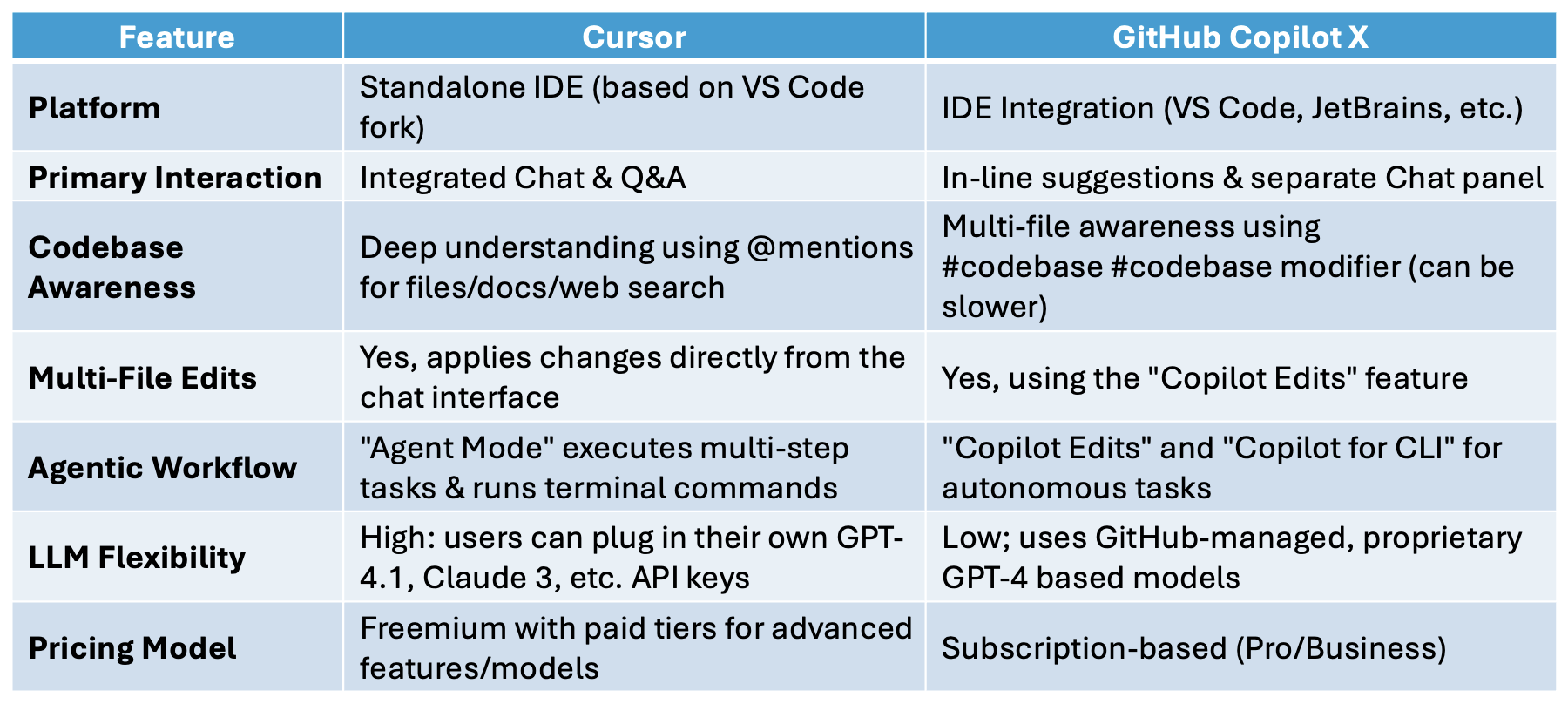 While both aim to augment the developer’s capability using large language models, they approach the problem from fundamentally different directions: an AI-first environment versus an AI-powered integration.