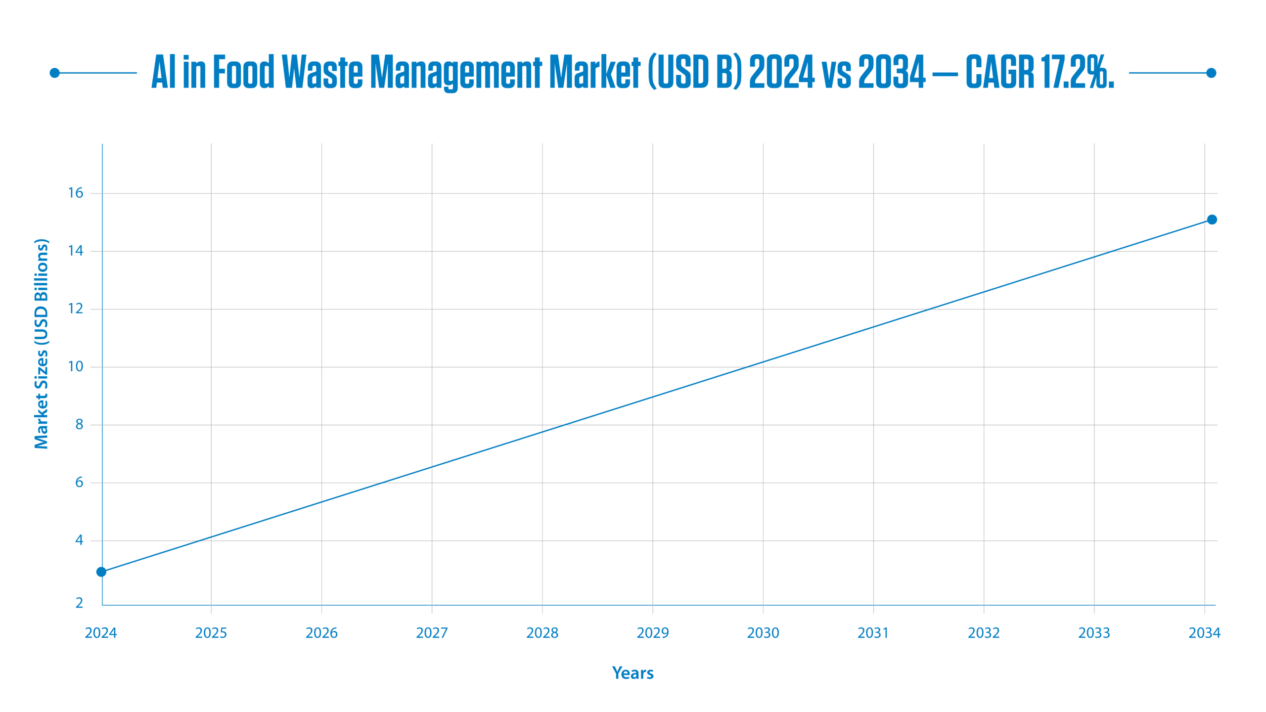 Global Market Size & Growth-The AI in Food Waste Management Market was valued at USD 3.10 billion in 2024 and is projected to reach USD 15.16 billion by 2034, growing at a CAGR of 17.2%.