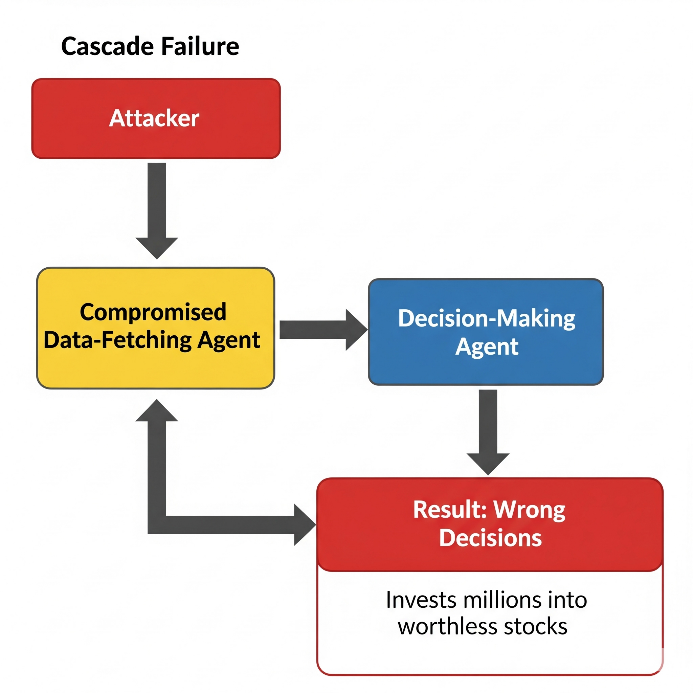 Example: A research agent cites fake sources → another agent uses them in a report → misinformation spreads.
