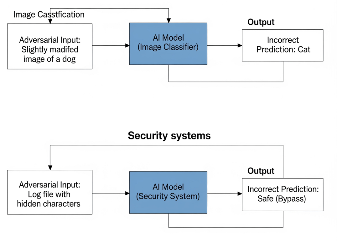 Adversarial Inputs – Crafted inputs (e.g., manipulated text, images) trick models into misclassification.
