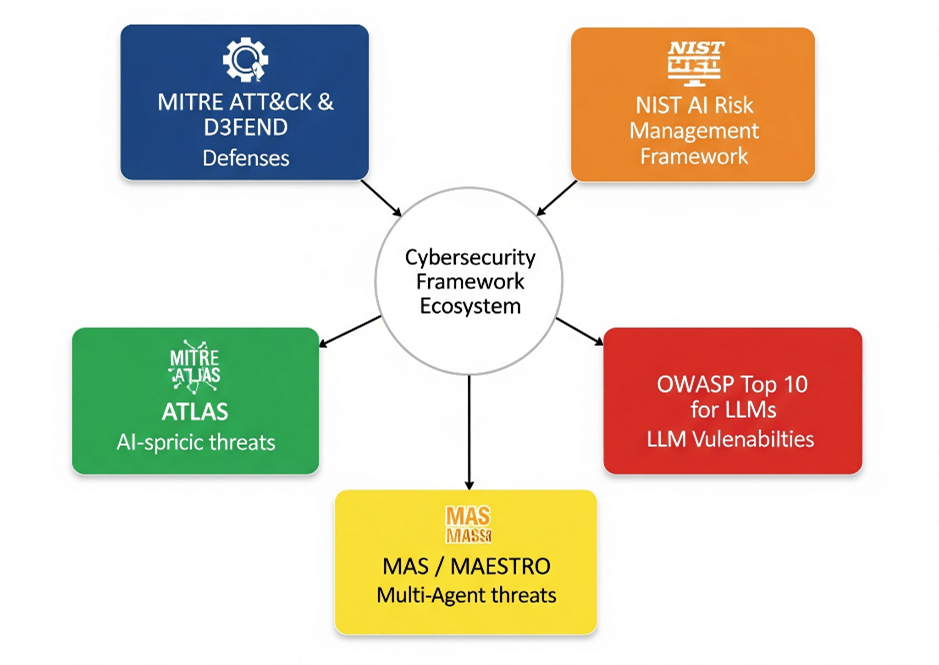 - Implement MITRE ATLAS, ATT&CK, D3FEND, and MAS/MAESTRO for structured threat modeling.