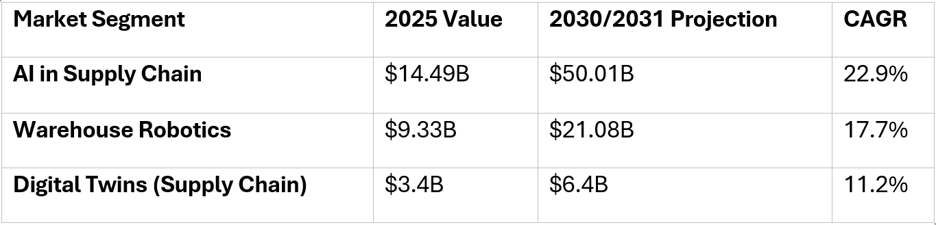 The warehouse robotics market alone will more than double in five years, driven by explosive e-commerce growth and labor challenges.