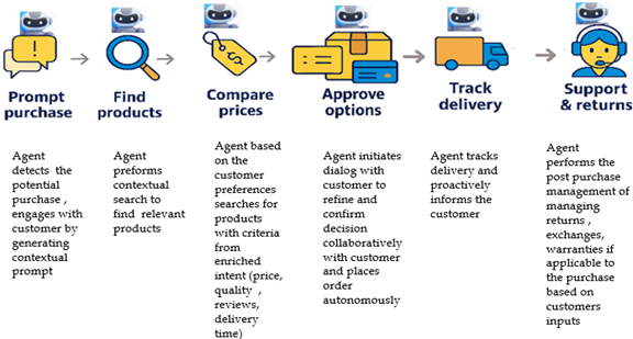 | Product Discovery & Recommendation | Agentic systems act as personal shopping assistants that understand user preferences, budget, and context. They can handle requests sent via text, find and compare products, and complete purchases autonomously. These agents also help users discover products through images and recover abandoned carts by offering reminders or incentives. | Saves time for customers by eliminating manual search, improving personalization and conversion rates for retailers, Reduces decision fatigue for consumers |
