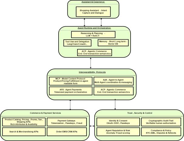 - Intelligent agents – brain of the agentic commerce, which understand the intent, powered by LLM. The different types of agents are Buyer, Seller, Service and Fulfillment agents Agent Orchestration layer – coordination and governance layer managing multiple agents’ interaction powered by workflow engines, model routers and context sharing protocols (MCP). Routing between agents, conversation contexts, decision logic, and rules enforcement is managed.