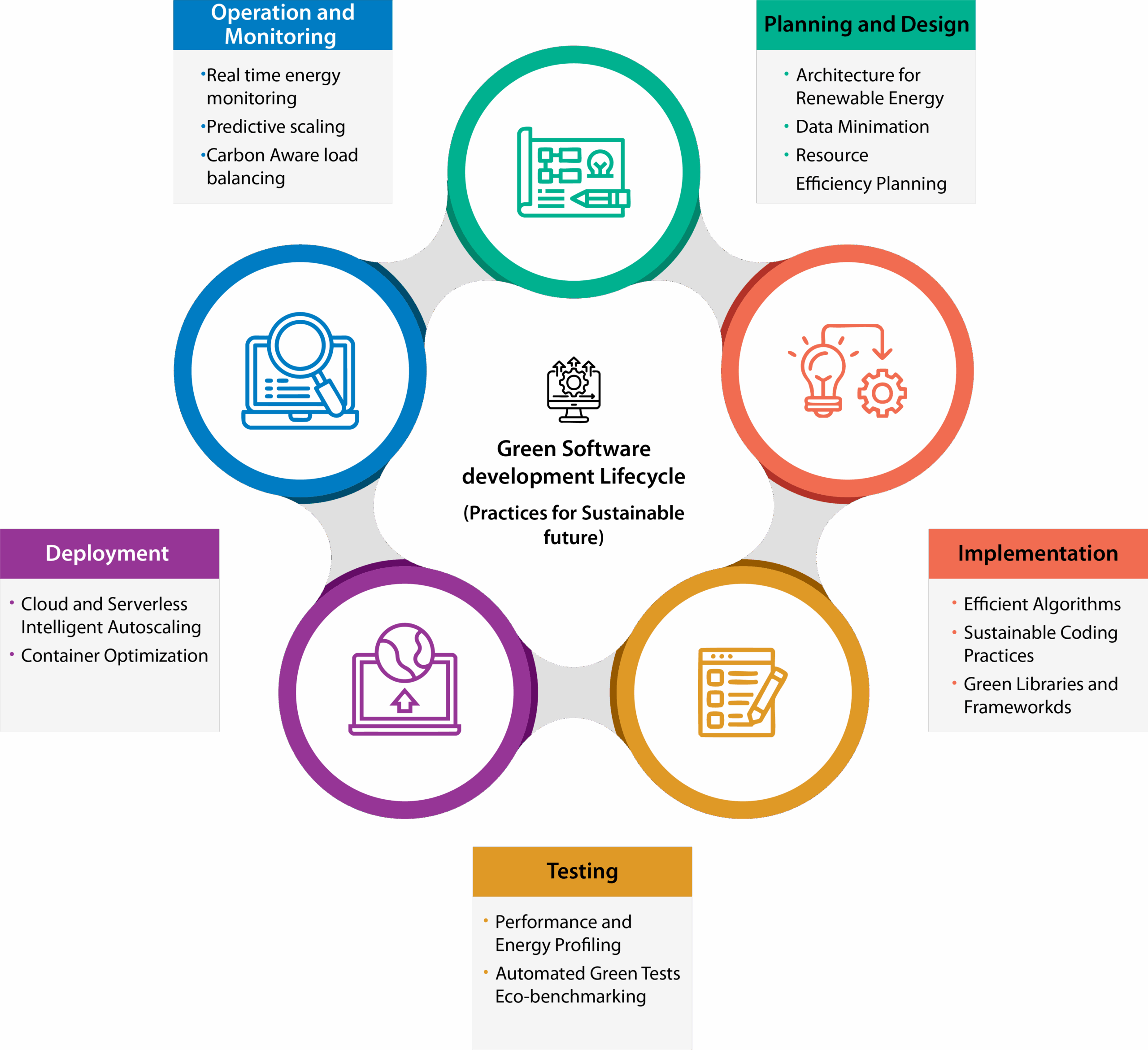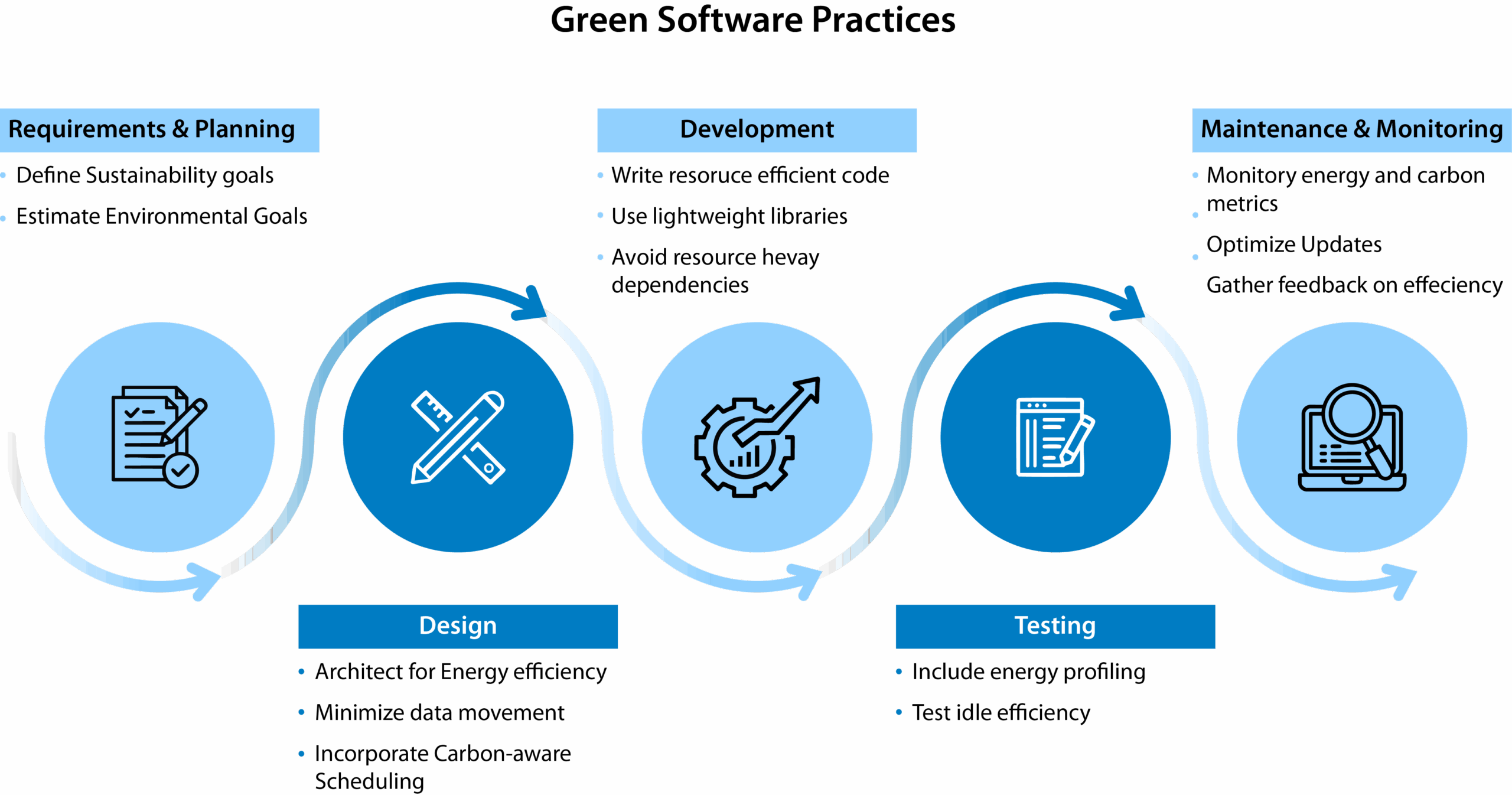 The software development lifecycle for green software development integrates sustainability considerations at every stage of the traditional process. The goal is to minimize the environmental impact of software from its initial concept to its eventual decommissioning.