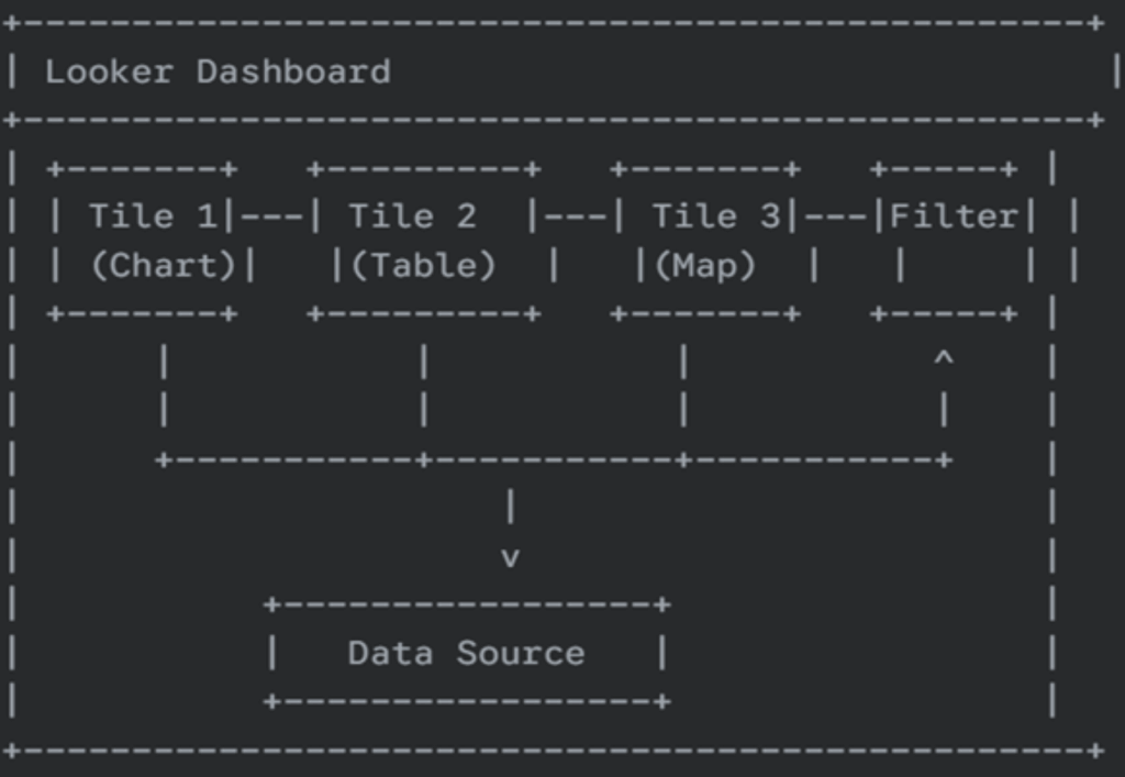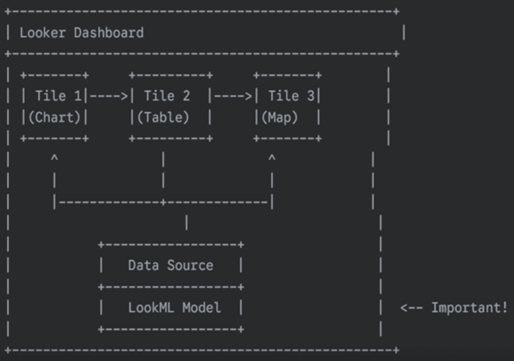 This diagram adds the LookML Model. LookML is the crucial layer that sits between the dashboard and the data source. It defines the data relationships, calculations, and dimensions that are available for use in the tiles. The tiles don’t directly query the database; they query the LookML model.