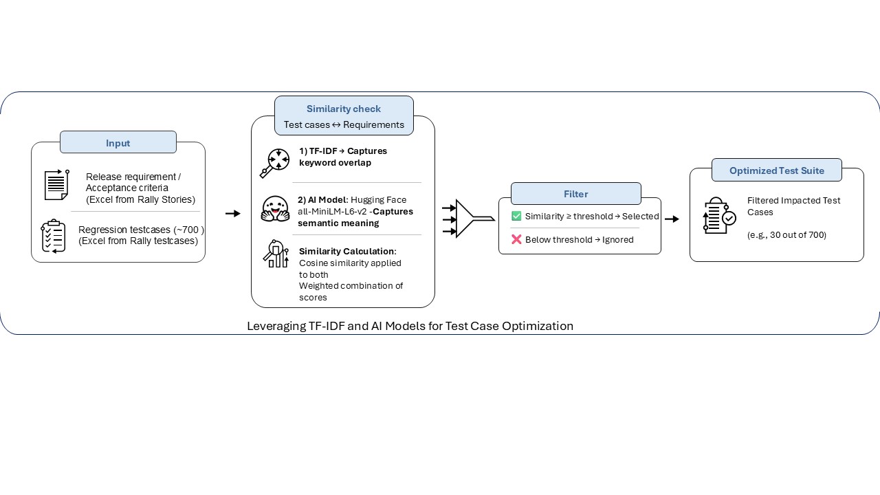 While commercial AI solutions exist, many organizations are reluctant to leverage them due to high licensing costs and complex integrations. Open‑source frameworks (like Hugging Face) and Python libraries (such as scikit‑learn and Sentence Transformers) enable enterprises to build scalable, explainable, and cost‑effective in‑house AI‑driven testing solutions.
